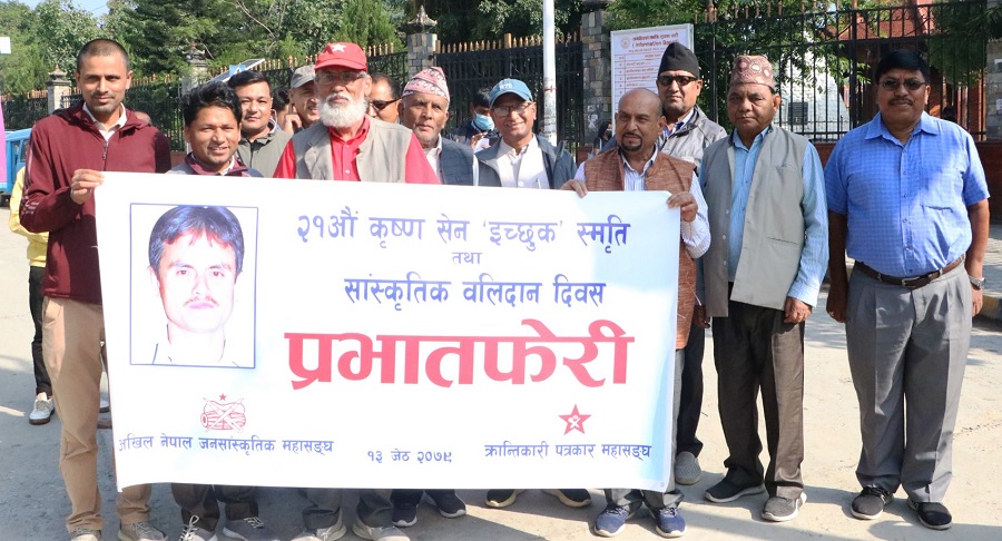 काठमाडौं । माओवादी सशस्त्र द्वन्द्वका क्रममा प्रहरी हिरासतमा मारिएका पत्रकार कृष्ण सेन ‘इच्छुक’को २१ औं स्मृति दिवसका अवसरमा शुक्रबार काठमाडौंमा प्रभातफेरी गरिए...